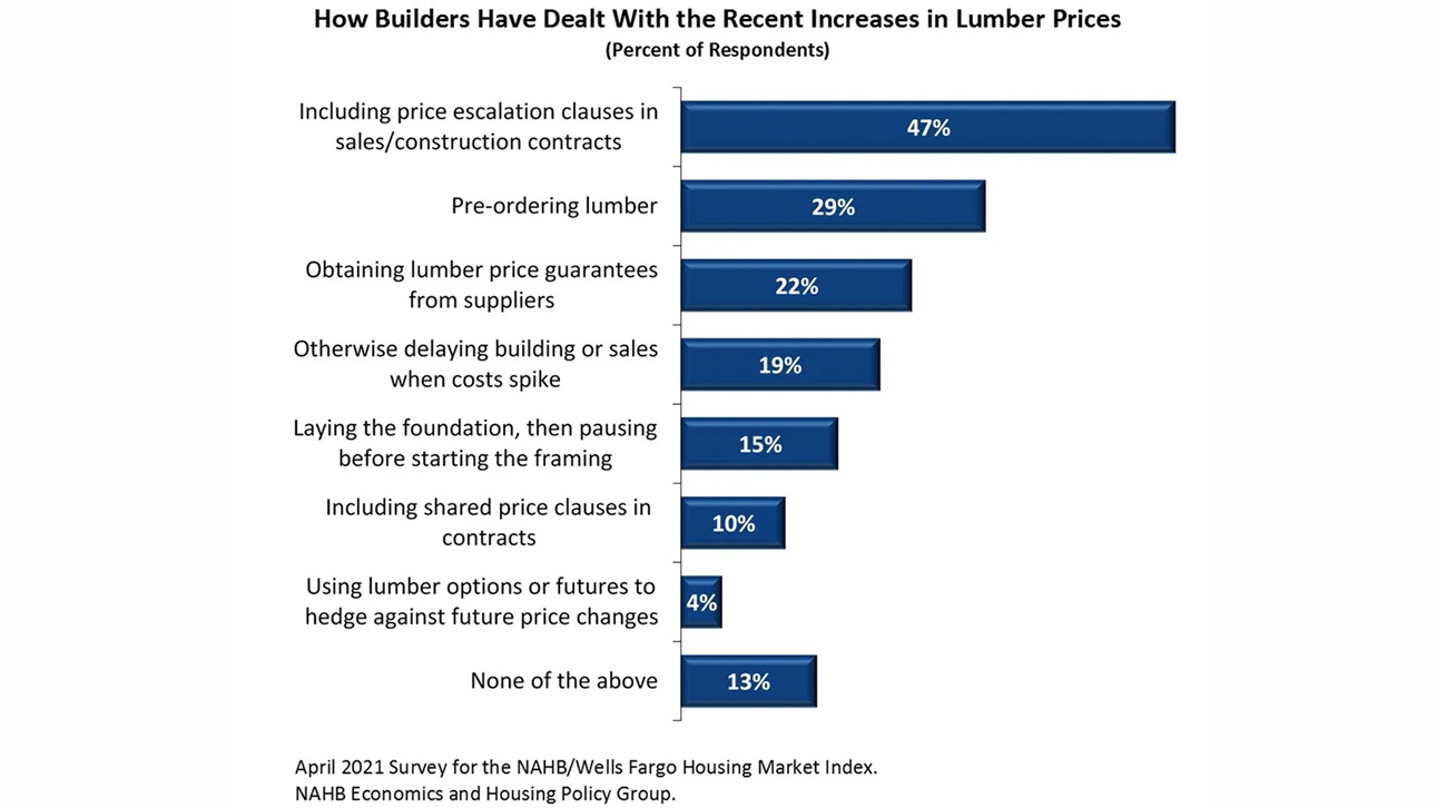 NAHB recently asked builders about their reactions to the rising and volatile lumber prices in its April 2021 survey for the NAHB/Wells Fargo Housing Market Index (HMI). Nearly half (47%) of single-family builders in the HMI panel indicated that they were including price escalation clauses in their sales contracts as their primary mitigation effort.